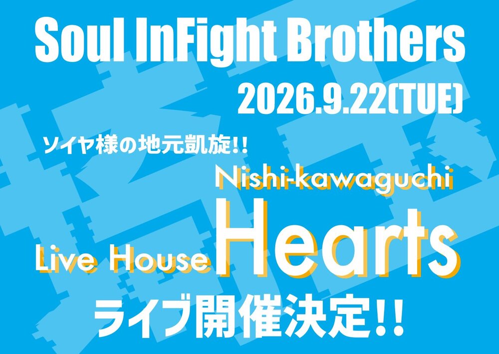 support for Soul InFight Brothers SCHEDULE 2026/09/22(火) 西川口Live House Hearts 地図を表示 Soul InFight Brothers pre. イベント詳細はしばらくお待ちください URLをコピーする 報告する